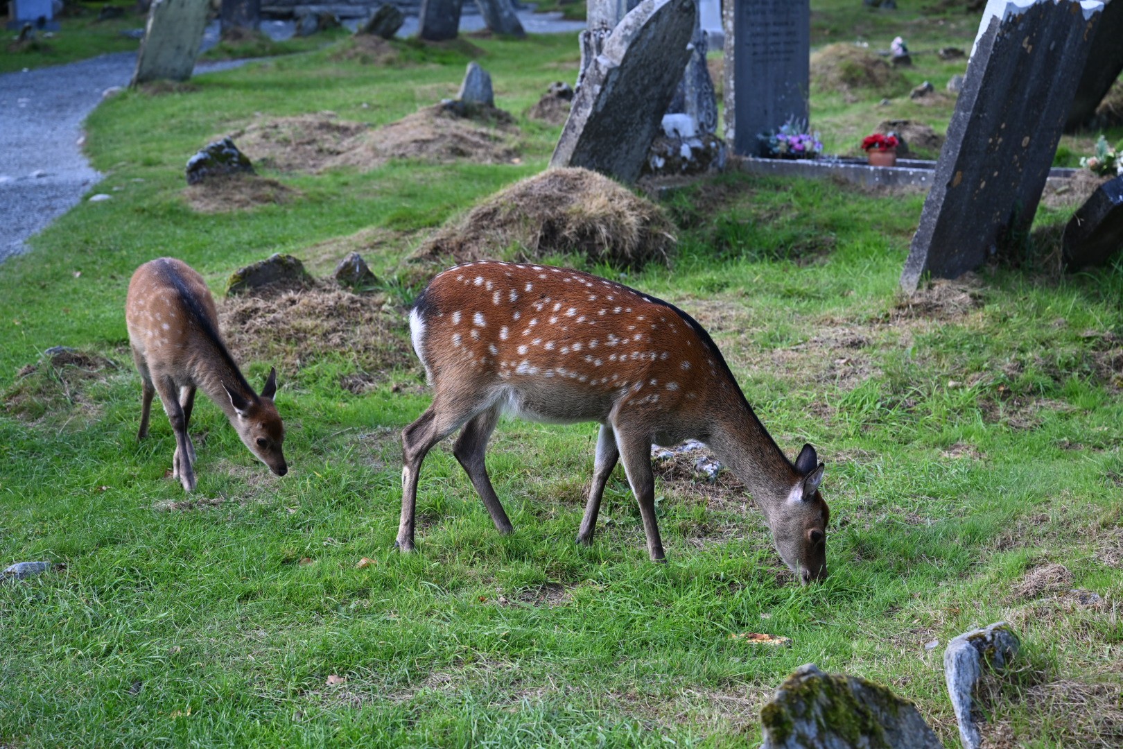 Deer (probably introduced sika deer – cervus nippon) grazing among the gravestones at Glendalough.