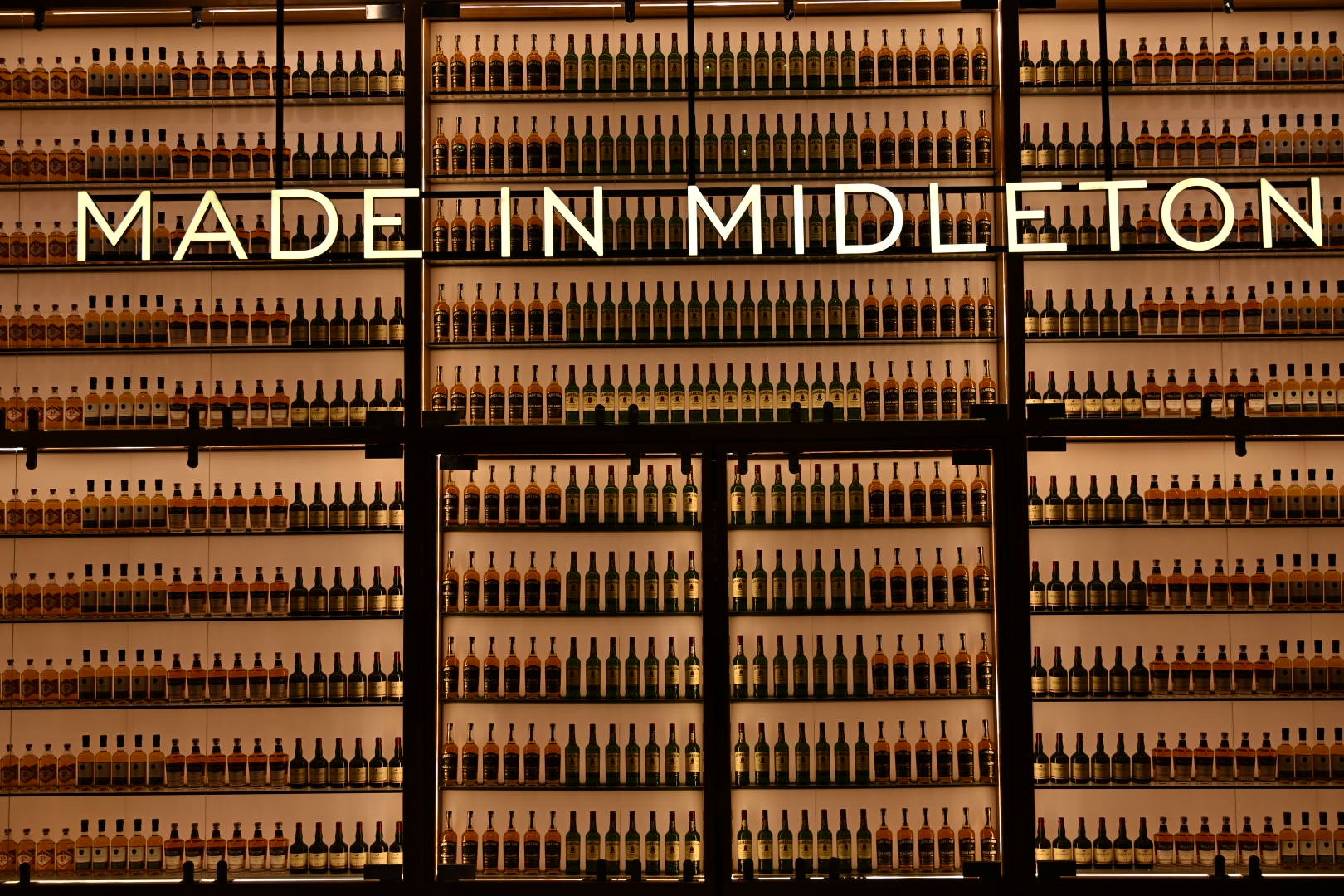 Display wall at Midleton Distillery, showing bottles of many of the brands produced there.